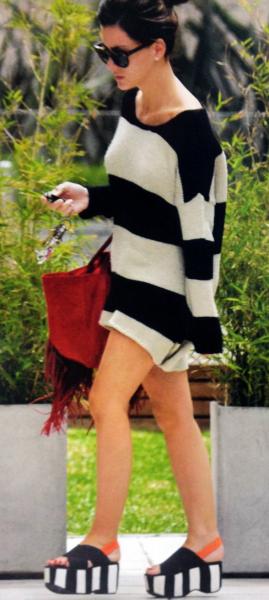 A China Suárez se adiantou à primavera com um conjuntinho bem liviano; sweater listrado amplo (acreditamos que com algo abaixo, mas não se vê), mega plataformas da última temporada de Ricky Sarkany ($1400 aprox.), e bolsa de camurça roja con babados. Ela sempre bela....Aqui lhes deixo a foto inteira: